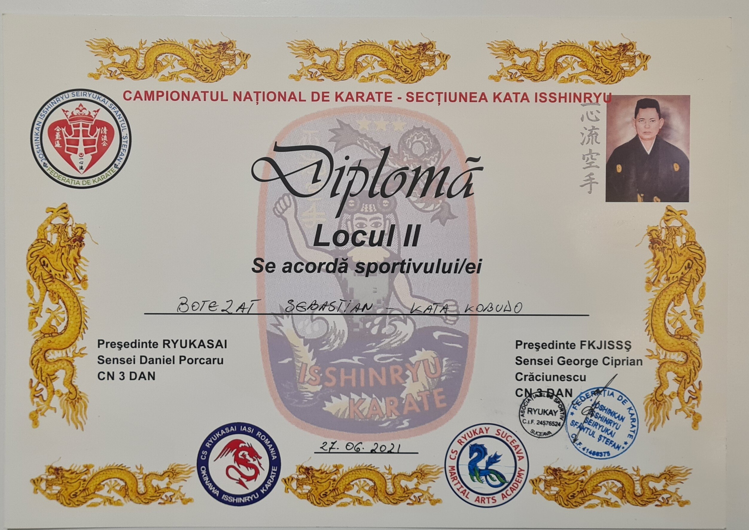 Între anii 2017 și 2024, am avut privilegiul de a fi parte dintr-un grup dedicat învățării și practicării stilului Okinawa Isshinryu Karate-Do la Academia de Arte Marțiale Ryukay sub indrumarea lui Sensei Craciunescu Ghe. George Ciprian centura neagră 7 dan. Această experiență nu a fost doar o călătorie în lumea artei marțiale, ci și o oportunitate de a dezvolta prietenii durabile și de a învăța valori precum disciplina, respectul și determinarea. Fiecare an a adus noi provocări și realizări, iar instructorii noștri au fost mereu acolo pentru a ne ghida și a ne inspira să ne depășim limitele. Această comunitate a contribuit semnificativ la formarea mea ca practicant și m-a ajutat să cresc nu doar ca artist marțial, ci și ca persoană.